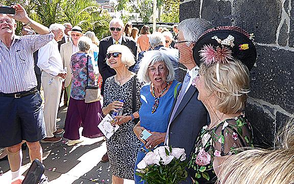 The other story of the day was Trish who chose to break a few wedding conventions and get married in black. Is there something in her past we don't know about! But not just any old black but an absolutely exquisite organza creation with the most beautiful floral pattern. It would have stood out on any catwalk. While Mick and Trish were both topped off with happiness Trish had something extra, a hat to die for! Indescribably lopsided, bursting with flowers, quite amazing. But can you see something else, a little mystery. Look at the last photo compared to others, what are those things there, nestling under the brim, a llama? a duck? a red-footed, yellow check turtle? Wonder who snuck 'em there. Much more imaginative than tying a few cans to the getaway car.