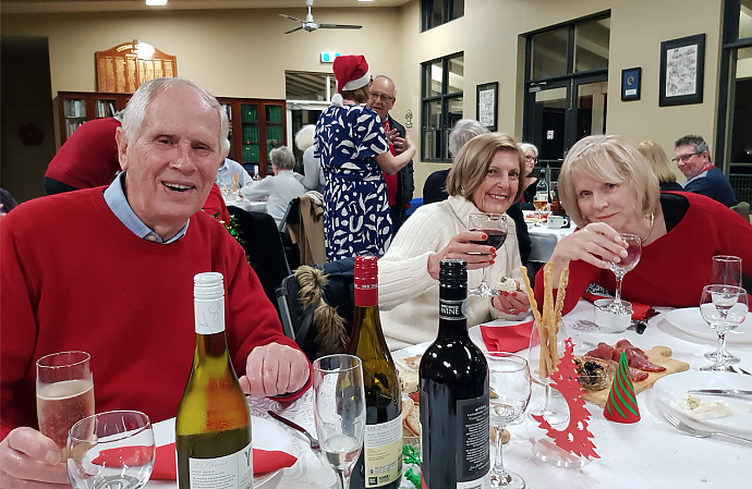What a night. Greetings at the front door by a Santa with inflated ideas of himself. Then inside for a Hot Mulled wine or sparkles or both. Christmas songs permiated throughout the evening from artists such as Mariah Carey, Andy Williams, Jose' Felicino and many others.