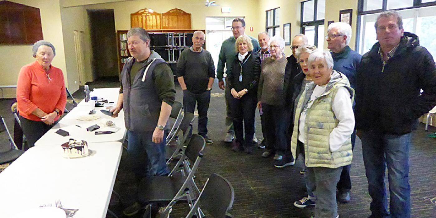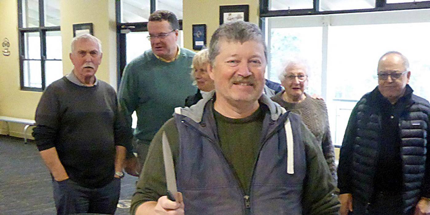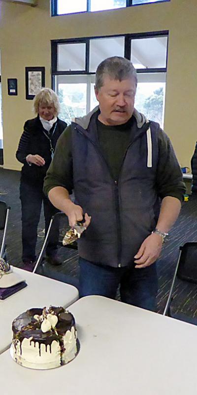 Saturday saw CPC having a birthday party for our President, Guy, and yes, our Marion was there too but sadly she declined to sing or anything else. Instead there was this amazing rich sticky cake which Guy found quite difficult to cut hence all the knife waving. He didn't find it difficult to eat though. It was bucketing with rain all afternoon so no play and the 14 of us chatted and played cards and sang Happy Birthday. It was a special occasion for Guy in more ways than one. Not just turning 50, or was it more, but also celebrating exciting new career horizons, soon to be going on holiday and to our delight confirming another year as our President. Quite a lot to celebrate. The cake got the better of the camera man who shuddered with glee and, as the photos show, couldn't focus on anything, apart from the cake that is."