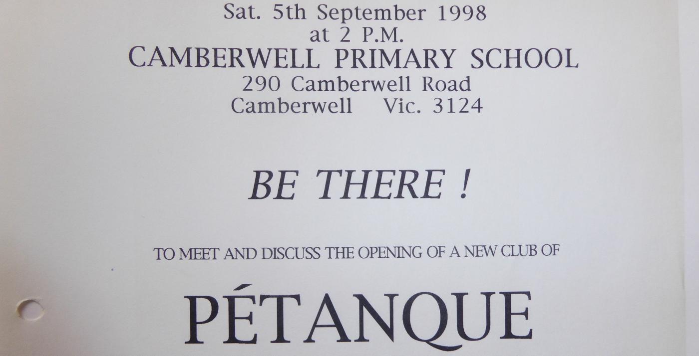 Camberwell Petanque Club was started by Don Miller and Christian Draschler on 5th September 1998. It had 13 members and an unused area at a bowling club in St James Park, Hawthorn.