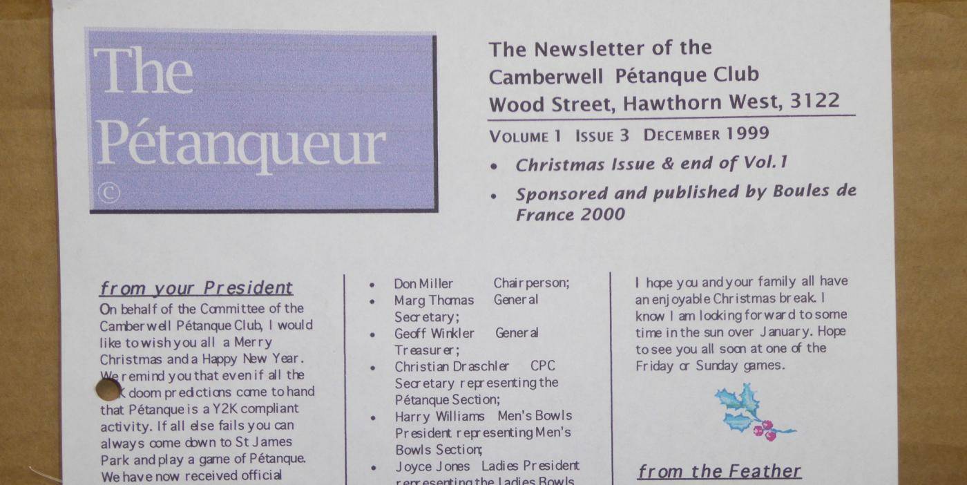 Publicity was needed and the first edition of "The Petanqueur" came out in mid 1999. The Club was growing so the Council provided CPC with a small tin shed to house some tables and chairs. This started the delightful weekly BYO dinners under the trees and stars (and occasional rain).