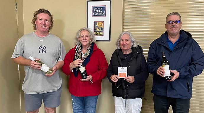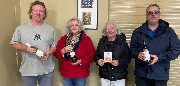 The teams are usually pairs but sometimes triples depending on numbers. At the start of the afternoon, teams are randomly drawn for all 3 games by computer. This ensures you don't team up with the same person twice though occasionally you may play against the same person more than once. Players are encouraged to play all 3 games otherwise it upsets the draws. At the end of the day prizes of bottles of wine are awarded to both male and female winners, the number of prizes depending on the number of players. Saturdays are essentially the same relaxed games as Wednesdays but usually with more players and with prizes.