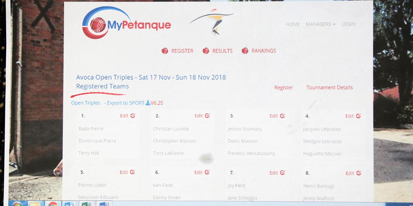 Images are pages from the My Petanque website showing the Home page, the page where you register your team and also the page where you can see which other teams have registered so you can check out who you may be playing against.
