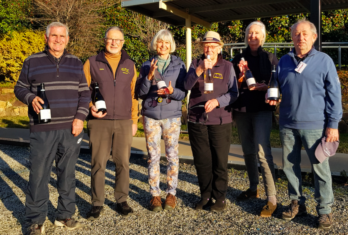 An hour later 33 competitors were straining their necks to see who their team mates were in a long afternoon of pétanque action. Once again, the Rex Rod was invoked during the course of play in some fiercely contested play.