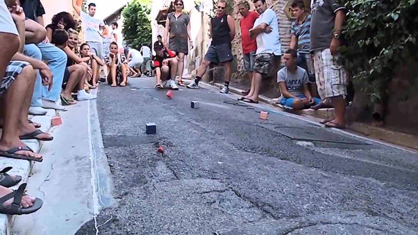 Championnat du monde de Boules Carrées 2019, 17 et 18 août 2019, Haut-de-Cagnes / Des boules carrées (cubes de bois rouges et bleus) dans une rue pentue.
