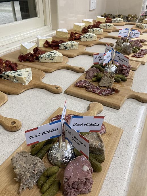 Wow! What a set up. French flag, bunting, red, white and blue balloons. You would have been forgiven had you thought the Western Bulldogs were celebrating another premiership win. JP and Di have to be applauded for the amount of effort and contribution they applied to the decorations on the evening. Did you see the mini Tours de Eiffel? And what about those individual labels on the charcuterie plates. The Presentation on the TV as well. All Excellent